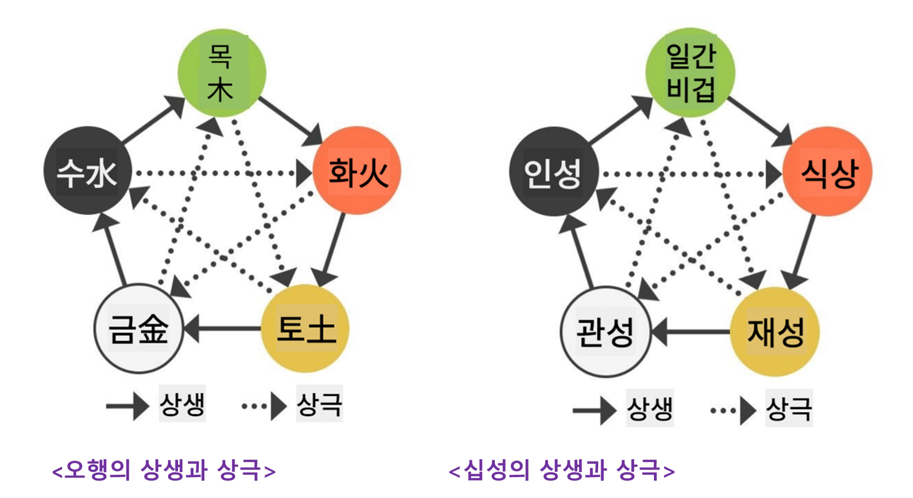이렇듯 오행은 <목→화→토→금→수> 순으로 생해준다. 목생화, 화생토, 토생금, 금생수, 수생목이라고 외우기도 한다.