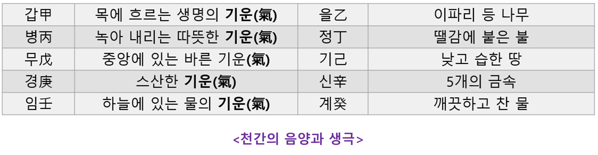 목, 화, 토, 금, 수 오행은 음양에 따라 또 열 개로 나뉜다.