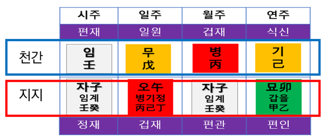 위에 가로 부분의 4개 글자가 천간이다.